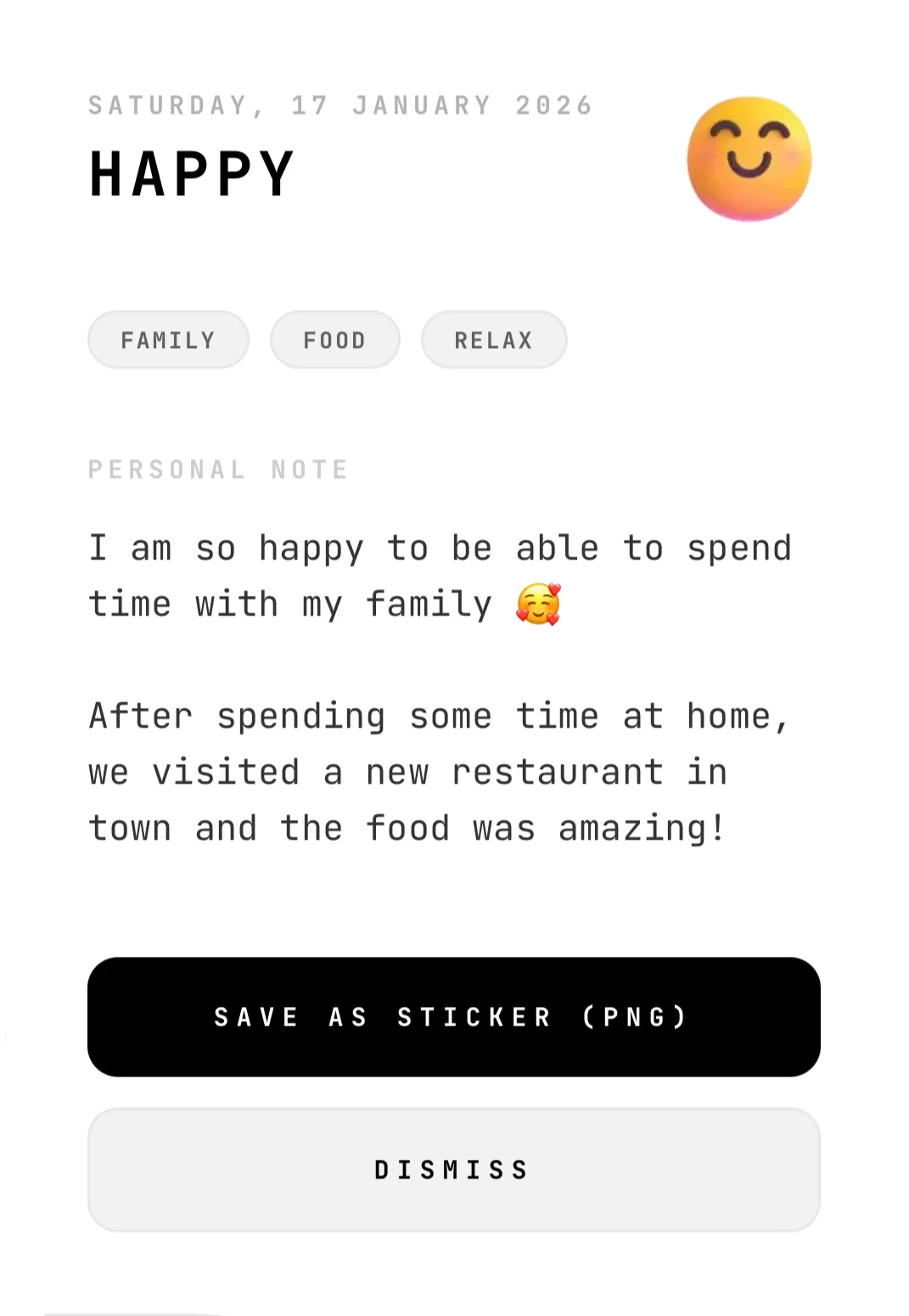 An app that you can use to track your mood, with a fun weekly, month and yearly overview. It is simple & quick. No need for long messages...